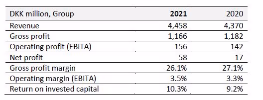 Operating profit (EBITA) was DKK 155.5m compared to DKK 142.2m in previous year. A like-for-like comparison of EBITA for 2020 and 2021 revealed an increase of 9.4% or DKK 13m as the result of strong improvements in the business, including optimized sourcing and sales pricing strategies. However, EBITA was also impacted negatively by costs related to strategic investments in digital innovation and development consultancies.