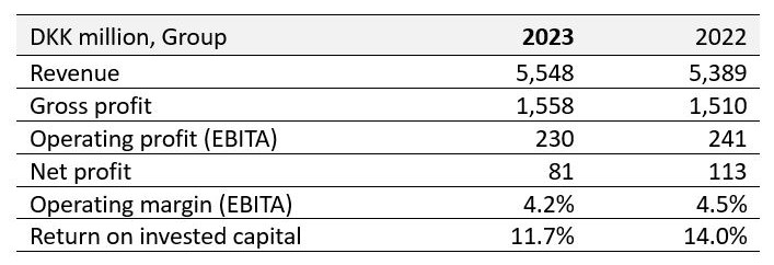 Operating profit (EBITA) was DKK 230.9m compared to DKK 240.9m in the previous year. A like-for-like comparison of EBITA for 2022 and 2023 uncovered a decrease of 4.2% or DKK 10m as the result of modest revenue growth and significant investments in new distribution centers, digitalization, as well as people capabilities.